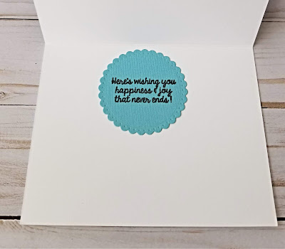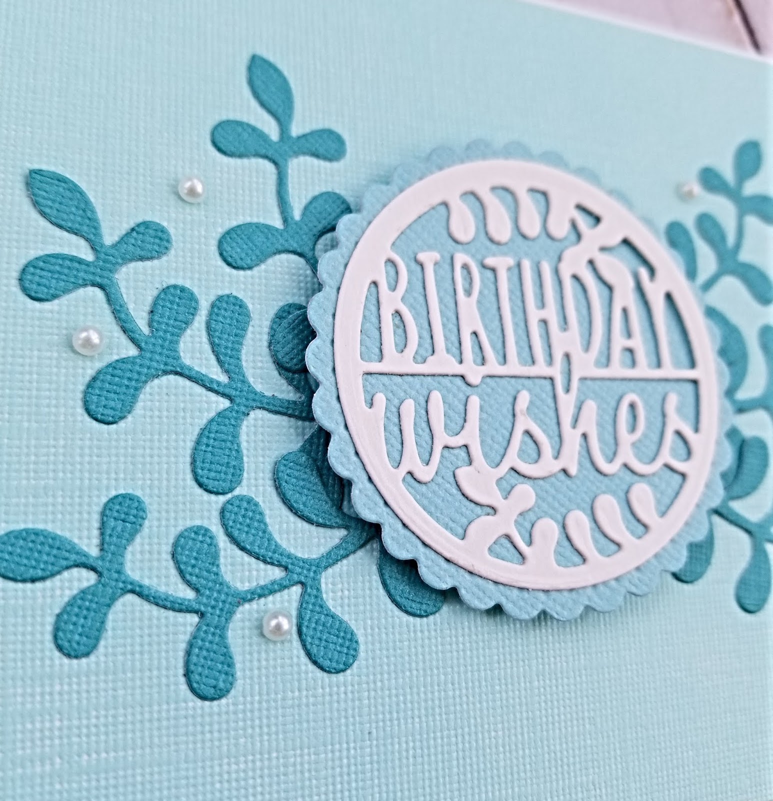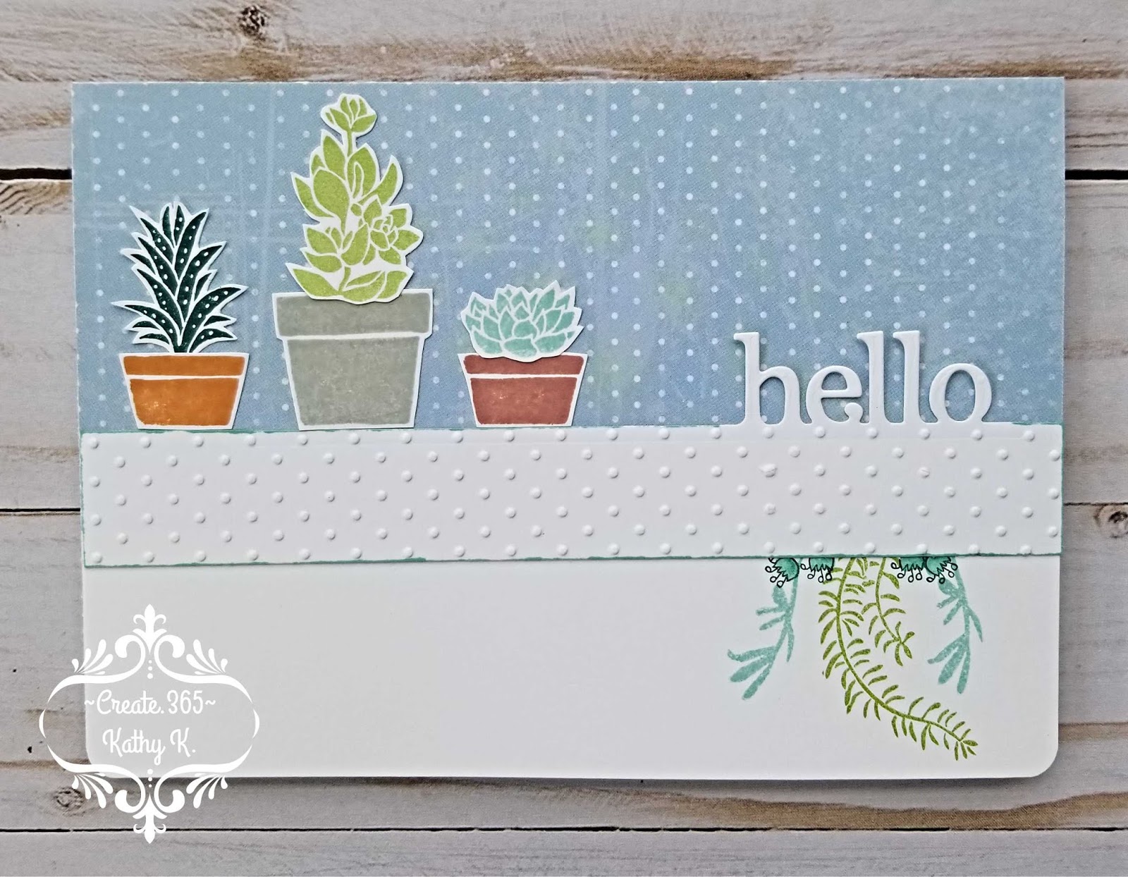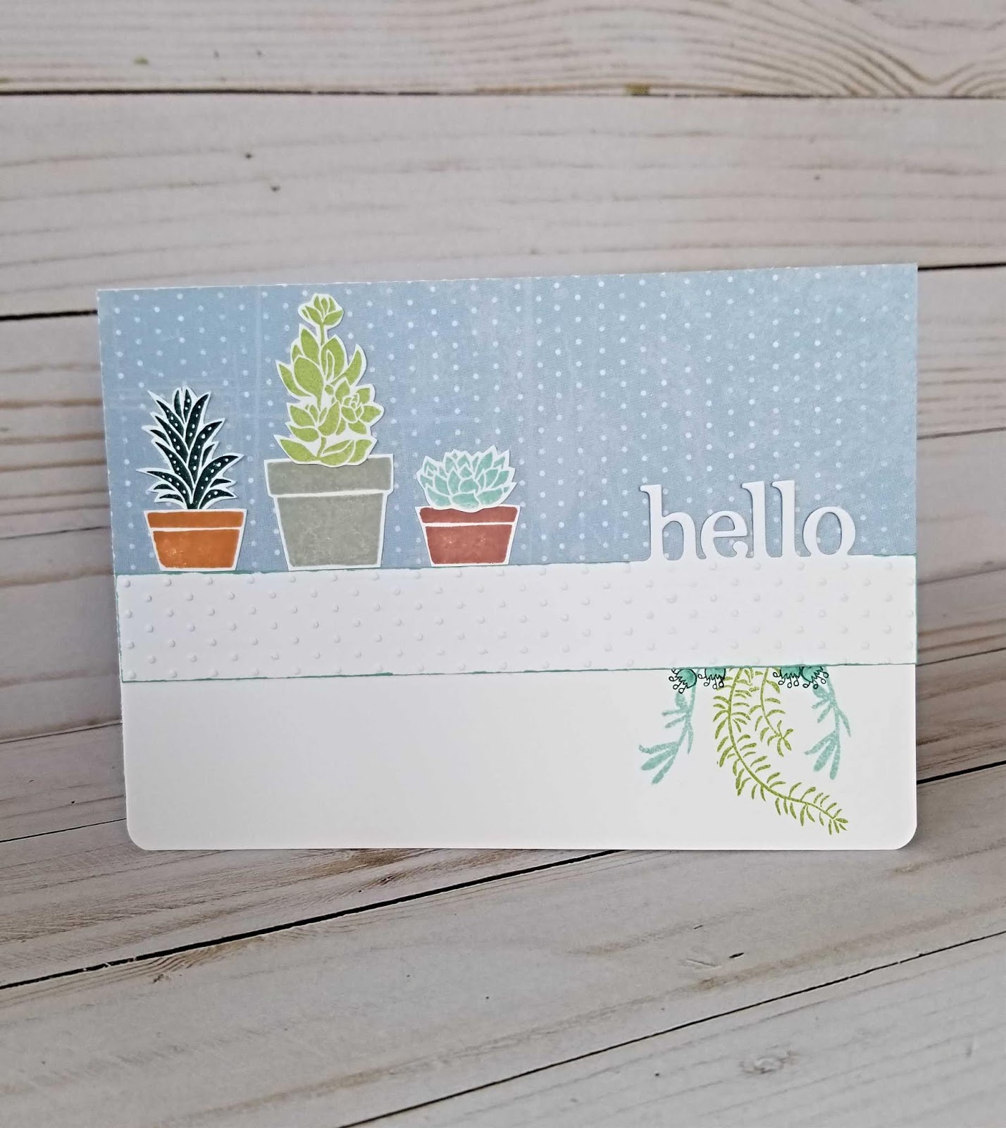 I fussy cut all the plant and pot images and then mounted them flat to the card front. I also used a diecut from Spellbinders for the "hello" edgecut and then carefully dry embossed selectively the area below with the tiny circle dots to tie it together with the blue pattern paper at the top of the card and add some dimensional interest.